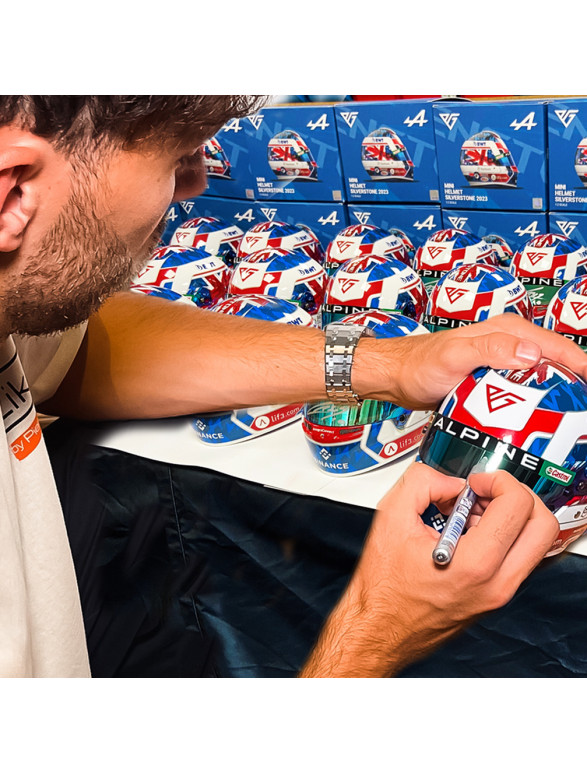 Este casco azul, rojo y blanco, usado por Pierre en el Gran Premio de Silverstone 2023, está firmado en la visera.