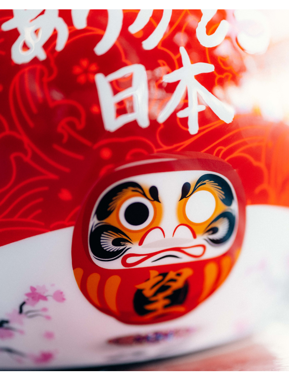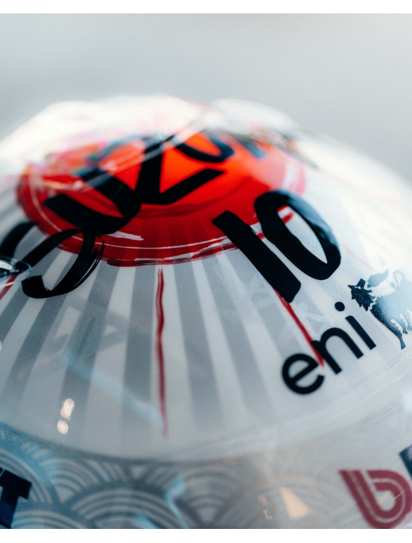 Este mini casco de edición limitada celebra Japón con un diseño único en colores rojo y blanco, decorado con flores de cerezo en el lateral y una visera roja. En la parte superior del casco está representado el sol rojo japonés, acompañado de la inscripción "Suzuka". En la parte trasera, un daruma simbólico y una inscripción en japonés rinden homenaje a este país emblemático del automovilismo.