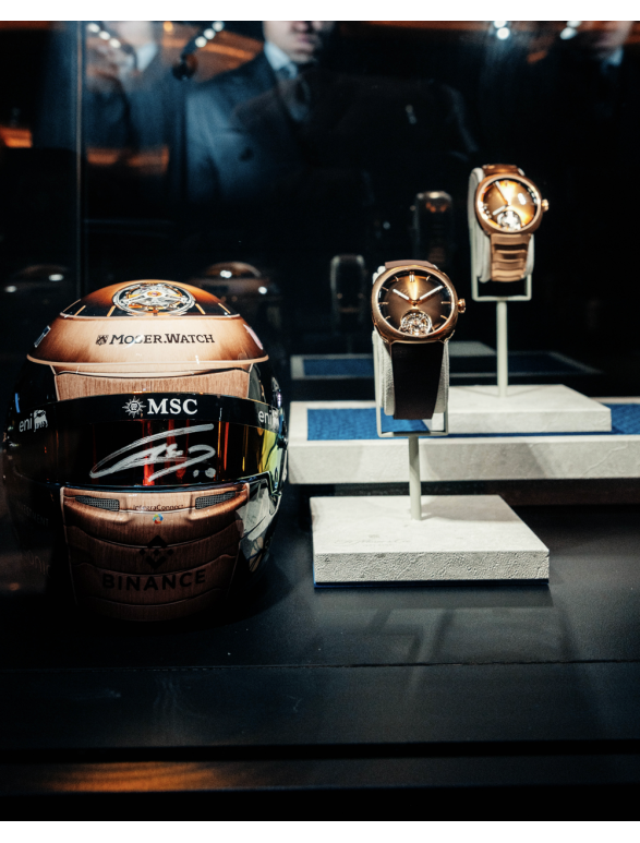 Este casco está inspirado en el reloj fruto de la colaboración entre Moser&Cie y Pierre Gasly.