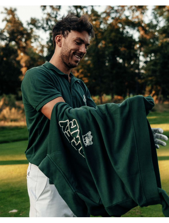 Ici, Un sweat zippé avec l'inscription Bogey Gang sur le dos, ses initiales sur le devant, tout en broderie.