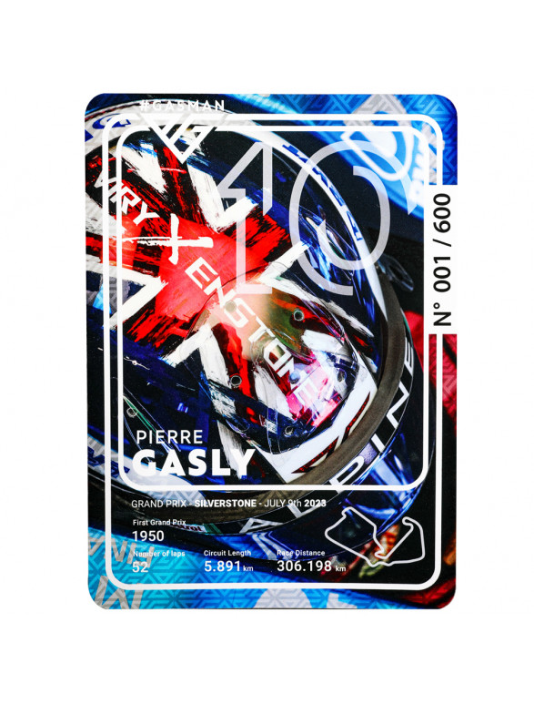 Questo casco blu, rosso e bianco, indossato da Pierre durante il Gran Premio di Silverstone 2023, è firmato sulla visiera.